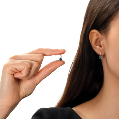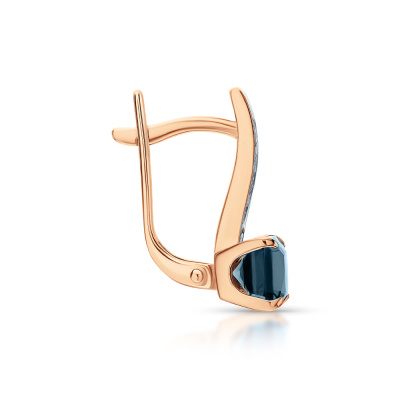 Серьги с 14 бриллиантами природными, 0.03 карат, огранка круг 17 граней, цвет 2, чистота 2, тип огранки А; 2 топазами лондон природными, 1.5 карат; Розовое золото 585 пробы.