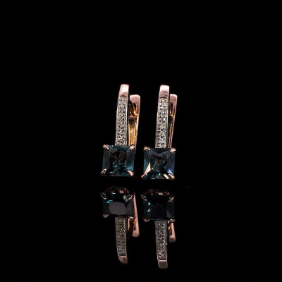 Серьги с 14 бриллиантами природными, 0.03 карат, огранка круг 17 граней, цвет 2, чистота 2, тип огранки А; 2 топазами лондон природными, 1.6 карат; Розовое золото 585 пробы.