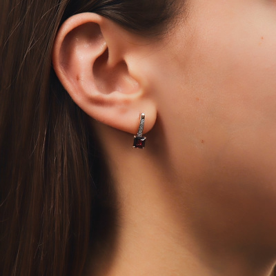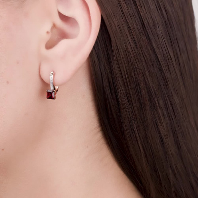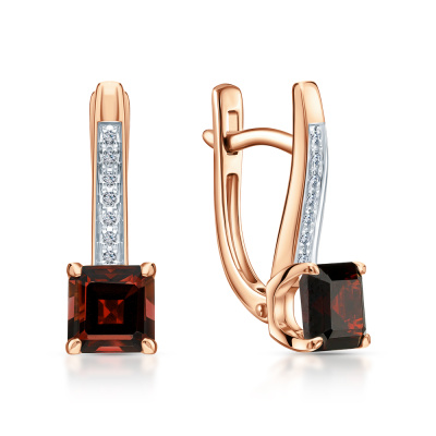 Серьги с 14 бриллиантами природными, 0.03 карат, огранка круг 17 граней, цвет 2, чистота 2, тип огранки А; 2 гранатами природными, 1.69 карат; Розовое золото 585 пробы.
