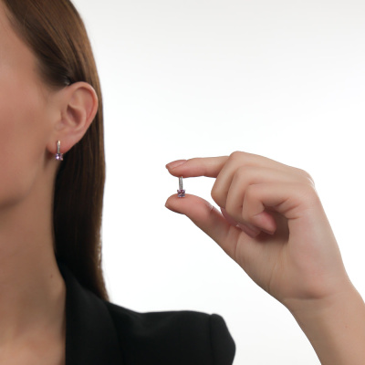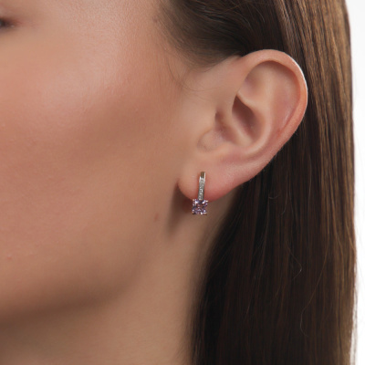 Серьги с 14 бриллиантами природными, 0.03 карат, огранка круг 17 граней, цвет 2, чистота 2, тип огранки А; 2 аметистами природными, 1.23 карат; Розовое золото 585 пробы.