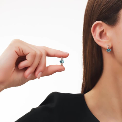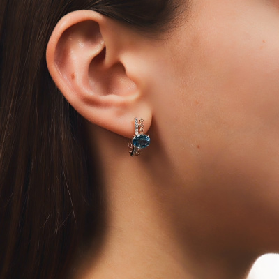 Серьги с 22 бриллиантами природными, 0.08 карат, огранка круг 17 граней, цвет 2, чистота 2, тип огранки А; 2 топазами свисс природными, 2.95 карат; 12 топазами бесцветными природными, 0.19 карат; Розовое золото 585 пробы.