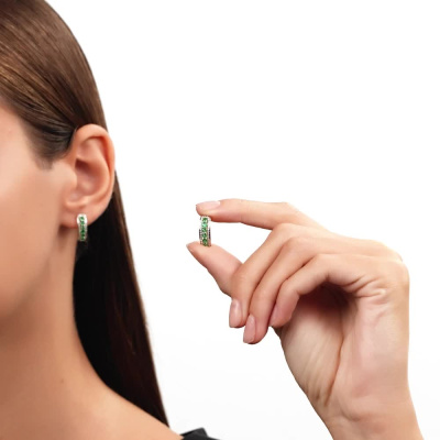 Серьги с 64 бриллиантами природными, 0.16 карат, огранка круг 17 граней, цвет 2, чистота 2, тип огранки А; 12 изумрудами природными, 0.65 карат, цвет 3, чистота 3, тип огранки В; Розовое золото 585 пробы.