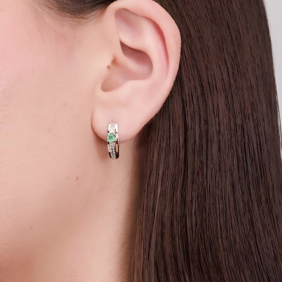 Серьги с 40 бриллиантами природными, 0.11 карат, огранка круг 17 граней, цвет 2, чистота 2, тип огранки А; 2 изумрудами природными, 0.27 карат, цвет 3, чистота 3, тип огранки В; Розовое золото 585 пробы.