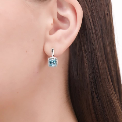 Серьги с 64 бриллиантами природными, 0.13 карат, огранка круг 17 граней, цвет 2, чистота 2, тип огранки А; 2 топазами свисс природными, 3.63 карат; Белое золото 585 пробы.
