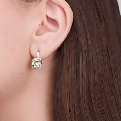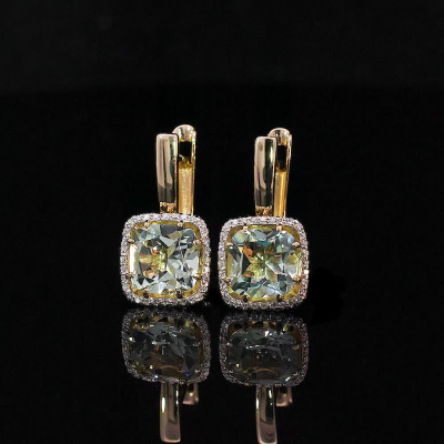 Серьги с 64 бриллиантами природными, 0.13 карат, огранка круг 17 граней, цвет 2, чистота 2, тип огранки А; 2 празиолитами природными, 2.71 карат; Желтое золото 585 пробы.