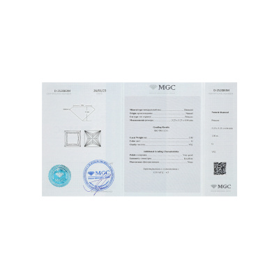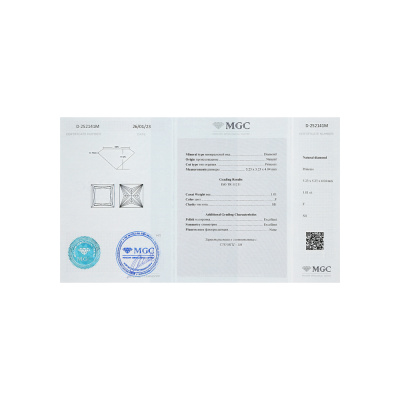 Серьги с 1 бриллиантом природным, 1.01 карат, огранка принцесса 65 граней, цвет 3, чистота 6, тип огранки А; 1 бриллиантом природным, 1 карат, огранка принцесса 65 граней, цвет 4, чистота 5, тип огранки А; Платина 950 пробы.