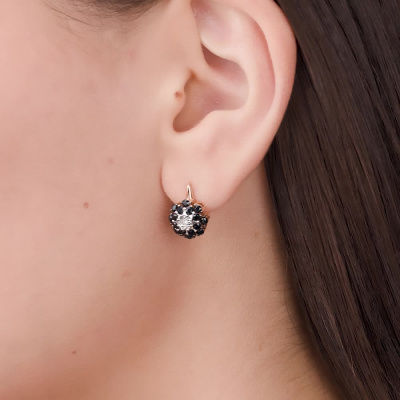 Серьги с 2 бриллиантами природными, 0.01 карат, огранка круг 17 граней, цвет 2, чистота 2, тип огранки А; 32 сапфирами черными природными, 1.41 карат, тип огранки В; Розовое и белое золото 585 пробы.