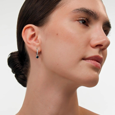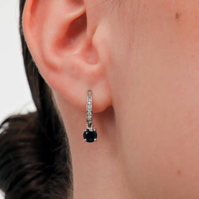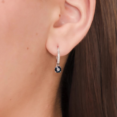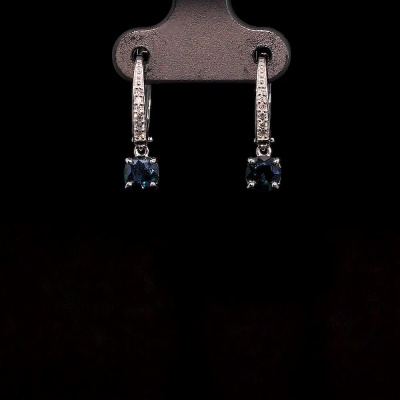 Серьги с 6 бриллиантами природными, 0.04 карат, огранка круг 57 граней, цвет 3, чистота 6, тип огранки А; 6 бриллиантами природными, 0.02 карат, огранка круг 17 граней, цвет 2, чистота 2, тип огранки Б; 2 сапфирами природными, 1 карат, цвет 2, чистота 2, тип огранки В; Белое золото 585 пробы.