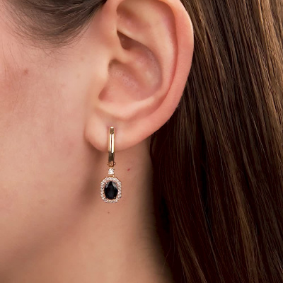 Серьги с 2 бриллиантами природными, 0.01 карат, огранка круг 17 граней, цвет 2, чистота 2, тип огранки А; 44 бриллиантами природными, 0.15 карат, огранка круг 17 граней, цвет 2, чистота 2, тип огранки А; 2 сапфирами природными, 1.8 карат, цвет 2, чистота 2, тип огранки Б; Розовое и белое золото 585 пробы.