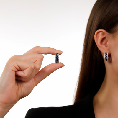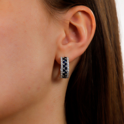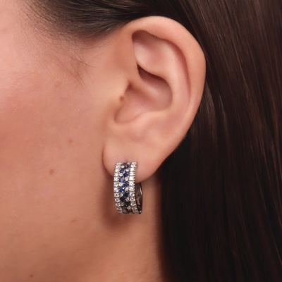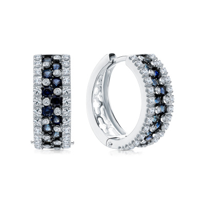 Серьги с 52 бриллиантами природными, 0.7 карат, огранка круг 57 граней, цвет 3, чистота 6, тип огранки А; 26 бриллиантами природными, 0.13 карат, огранка круг 17 граней, цвет 2, чистота 2, тип огранки Б; 26 сапфирами природными, 1.5 карат, цвет 2, чистота 2, тип огранки В; Белое золото 585 пробы.