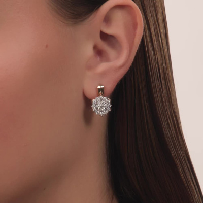 Серьги с 38 бриллиантами природными, 1.4 карат, огранка круг 57 граней, цвет 3, чистота 6, тип огранки А; Розовое и белое золото 585 пробы.
