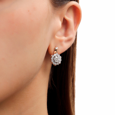 Серьги с 38 бриллиантами природными, 1.41 карат, огранка круг 57 граней, цвет 3, чистота 6, тип огранки А; Розовое и белое золото 585 пробы.