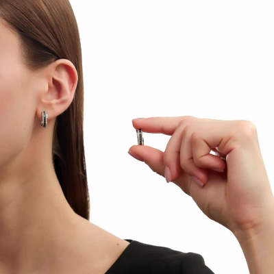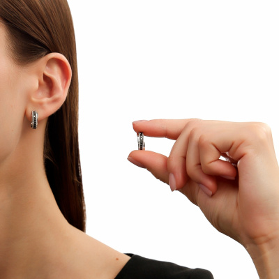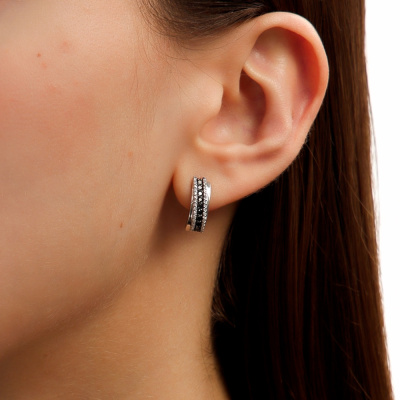 Серьги с 60 бриллиантами природными, 0.12 карат, огранка круг 17 граней, цвет 2, чистота 2, тип огранки А; 18 бриллиантами черными природными облагороженными, 0.24 карат, огранка круг 57 граней, цвет 7, чистота 6, тип огранки А; Белое золото 585 пробы.