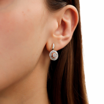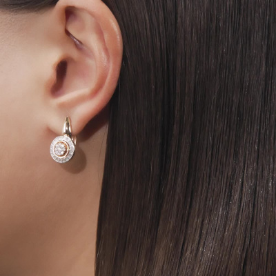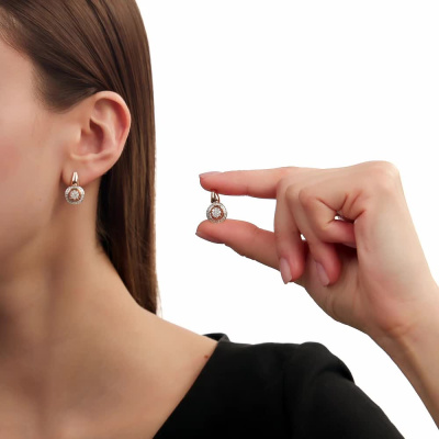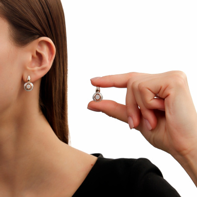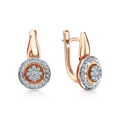 Серьги с 2 бриллиантами природными, 0.07 карат, огранка круг 57 граней, цвет 3, чистота 6, тип огранки А; 16 бриллиантами природными, 0.15 карат, огранка круг 57 граней, цвет 3, чистота 6, тип огранки А; 38 бриллиантами природными, 0.15 карат, огранка круг 17 граней, цвет 2, чистота 2, тип огранки А; Розовое золото 585 пробы.