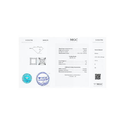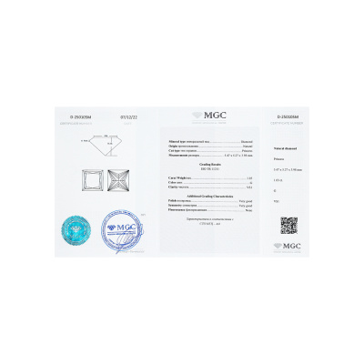 Серьги с 1 бриллиантом природным, 1.02 карат, огранка принцесса 65 граней, цвет 4, чистота 4, тип огранки А; 1 бриллиантом природным, 1 карат, огранка принцесса 65 граней, цвет 4, чистота 6, тип огранки А; Платина 950 пробы.