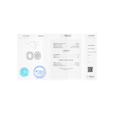 Серьги с 1 бриллиантом природным, 1.04 карат, огранка кушон 57 граней, цвет 4, чистота 6, тип огранки А; 1 бриллиантом природным, 1.01 карат, огранка кушон 57 граней, цвет 4, чистота 5, тип огранки А; Белое золото 750 пробы.