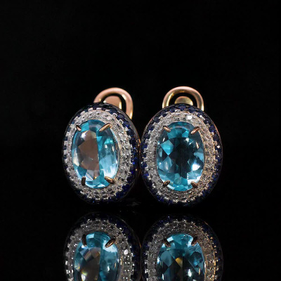 Серьги с 56 бриллиантами природными, 0.2 карат, огранка круг 17 граней, цвет 2, чистота 2, тип огранки Б; 2 топазами скай природными, 5.31 карат; 56 сапфирами природными, 0.57 карат, цвет 2, чистота 2, тип огранки В; Розовое золото 585 пробы.