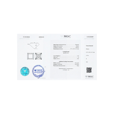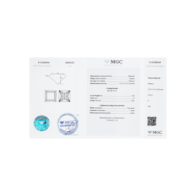 Серьги с 1 бриллиантом природным, 1.02 карат, огранка принцесса 65 граней, цвет 3, чистота 4, тип огранки А; 1 бриллиантом природным, 1.02 карат, огранка принцесса 65 граней, цвет 4, чистота 5, тип огранки А; Платина 950 пробы.