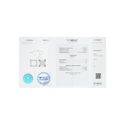 Серьги с 1 бриллиантом природным, 1.01 карат, огранка принцесса 65 граней, цвет 2, чистота 6, тип огранки А; 1 бриллиантом природным, 1 карат, огранка принцесса 65 граней, цвет 4, чистота 5, тип огранки А; Белое золото 750 пробы.