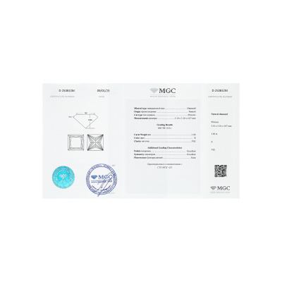 Серьги с 1 бриллиантом природным, 1.01 карат, огранка принцесса 65 граней, цвет 3, чистота 6, тип огранки А; 1 бриллиантом природным, 1 карат, огранка принцесса 65 граней, цвет 2, чистота 5, тип огранки А; Белое золото 750 пробы.
