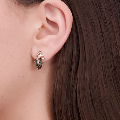 Серьги с 6 бриллиантами природными, 0.04 карат, огранка круг 17 граней, цвет 2, чистота 2, тип огранки А; 10 гидротермальными изумрудами, 0.14 карат; Розовое золото 585 пробы.