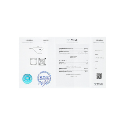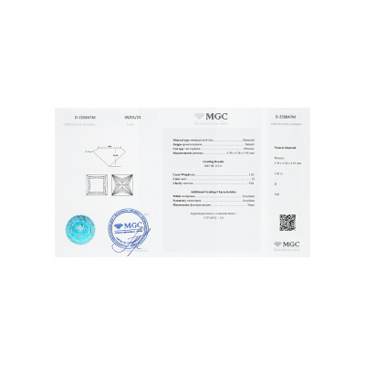 Серьги с 1 бриллиантом природным, 1.02 карат, огранка принцесса 65 граней, цвет 1, чистота 4, тип огранки А; 1 бриллиантом природным, 1.01 карат, огранка принцесса 65 граней, цвет 1, чистота 5, тип огранки А; Белое золото 750 пробы.