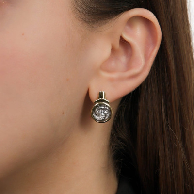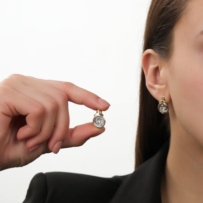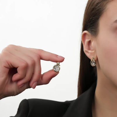 Серьги с 2 бриллиантами природными, 0.09 карат, огранка круг 57 граней, цвет 3, чистота 6, тип огранки А; 44 бриллиантами природными, 0.16 карат, огранка круг 57 граней, цвет 3, чистота 6, тип огранки А; Желтое и белое золото 585 пробы.