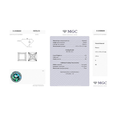 Серьги с 2 бриллиантами природными, 2.04 карат, огранка принцесса 65 граней, цвет 4, чистота 6, тип огранки А; Белое золото 750 пробы.