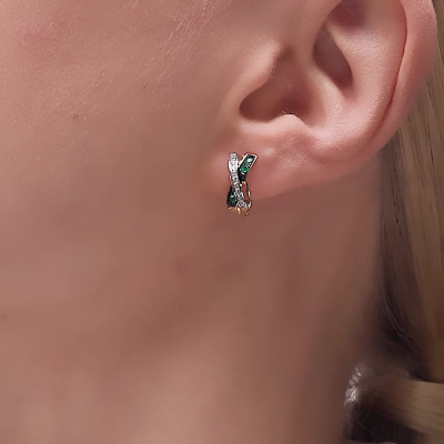 Серьги с 18 бриллиантами природными, 0.03 карат, огранка круг 17 граней, цвет 2, чистота 2, тип огранки Б; 6 изумрудами природными, 0.1 карат, цвет 3, чистота 3, тип огранки В; Желтое золото 585 пробы.