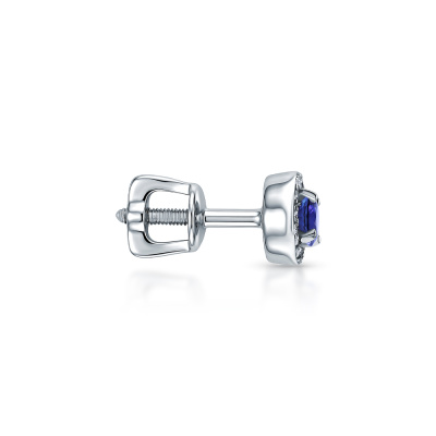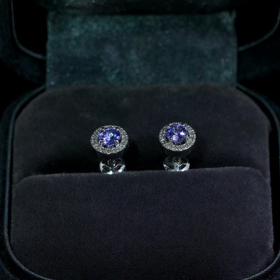 Серьги с 32 бриллиантами природными, 0.07 карат, огранка круг 17 граней, цвет 2, чистота 2, тип огранки Б; 2 танзанитами природными, 0.36 карат; Белое золото 585 пробы.