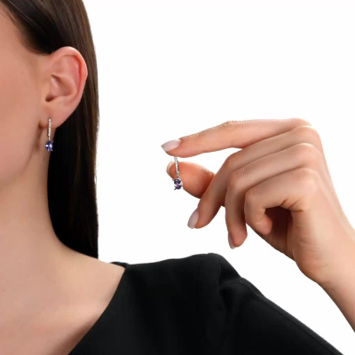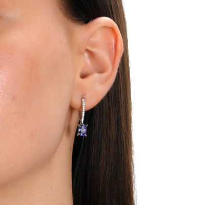 Серьги с 18 бриллиантами природными, 0.12 карат, огранка круг 57 граней, цвет 4, чистота 5, тип огранки А; 2 танзанитами природными, 1.53 карат; Белое золото 585 пробы.