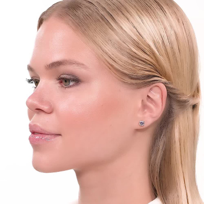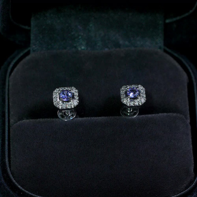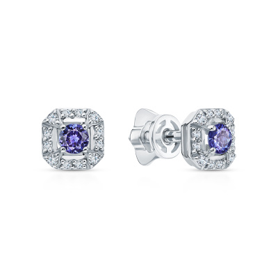 Серьги с 24 бриллиантами природными, 0.08 карат, огранка круг 17 граней, цвет 2, чистота 2, тип огранки Б; 2 танзанитами природными, 0.2 карат; Белое золото 585 пробы.
