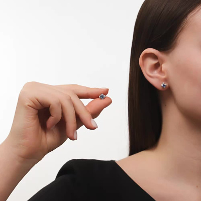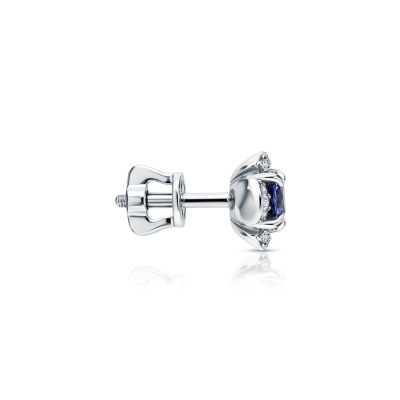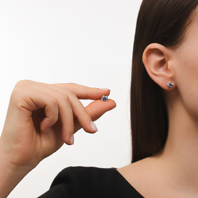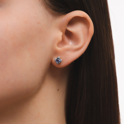 Серьги с 24 бриллиантами природными, 0.07 карат, огранка круг 57 граней, цвет 4, чистота 5, тип огранки А; 2 танзанитами природными, 0.74 карат; Белое золото 585 пробы.