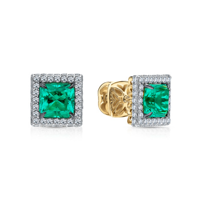 Серьги с 104 бриллиантами природными, 0.61 карат, огранка круг 57 граней, цвет 3, чистота 6, тип огранки А; 2 изумрудами ГТ Колумбия, 2.15 карат; Желтое золото 585 пробы.