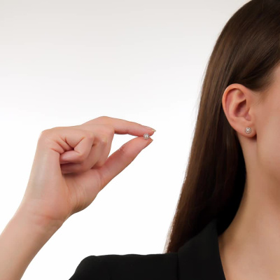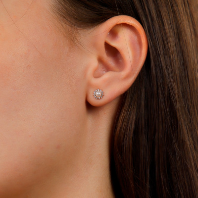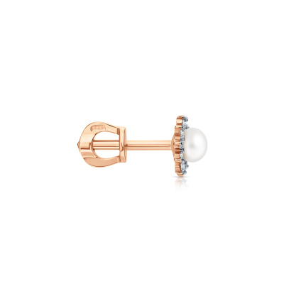 Серьги с 22 бриллиантами природными, 0.06 карат, огранка круг 17 граней, цвет 2, чистота 2, тип огранки А; 2 жемчугами пресноводными культ.белыми, 0.41 карат; Розовое золото 585 пробы.