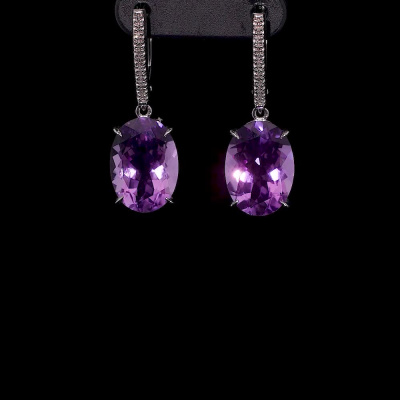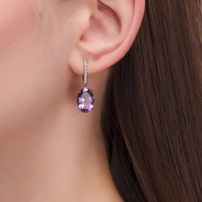 Серьги с 22 бриллиантами природными, 0.07 карат, огранка круг 17 граней, цвет 2, чистота 2, тип огранки А; 2 аметистами природными, 10.96 карат; Белое золото 585 пробы.