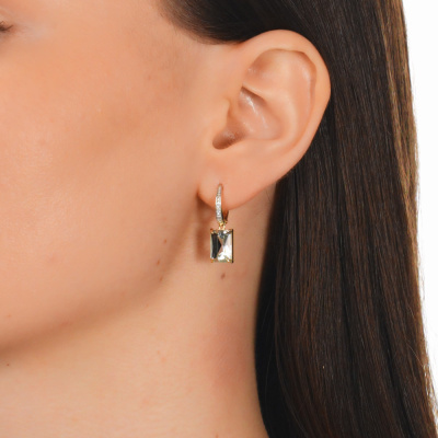 Серьги с 6 бриллиантами природными, 0.04 карат, огранка круг 17 граней, цвет 2, чистота 2, тип огранки А; 6 бриллиантами природными, 0.02 карат, огранка круг 17 граней, цвет 2, чистота 2, тип огранки А; 2 празиолитами природными, 4.49 карат; Желтое золото 585 пробы.