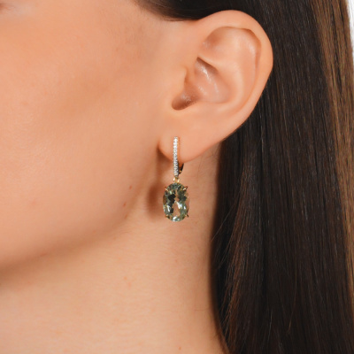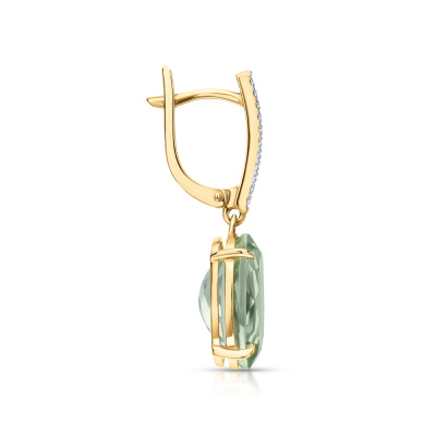 Серьги с 22 бриллиантами природными, 0.07 карат, огранка круг 17 граней, цвет 2, чистота 2, тип огранки А; 2 празиолитами природными, 9.78 карат; Желтое золото 585 пробы.