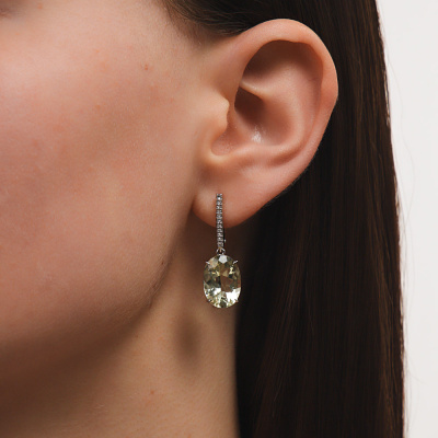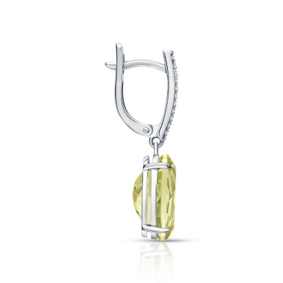 Серьги с 22 бриллиантами природными, 0.07 карат, огранка круг 17 граней, цвет 2, чистота 2, тип огранки А; 1 кварцем лимонным природным, 5.82 карат; 1 кварцем лимонным природным, 5.6 карат; Белое золото 585 пробы.