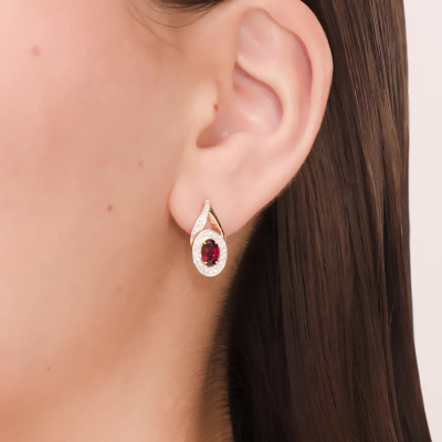 Серьги с 46 бриллиантами природными, 0.21 карат, огранка круг 17 граней, цвет 2, чистота 2, тип огранки А; 8 бриллиантами природными, 0.01 карат, огранка круг 17 граней, цвет 2, чистота 2, тип огранки А; 2 гранатами природными, 1.1 карат; Розовое золото 585 пробы.