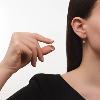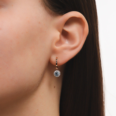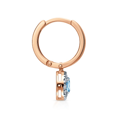 Серьги с 24 бриллиантами природными, 0.09 карат, огранка круг 17 граней, цвет 2, чистота 2, тип огранки А; 2 топазами свисс природными, 0.54 карат; Розовое золото 585 пробы.