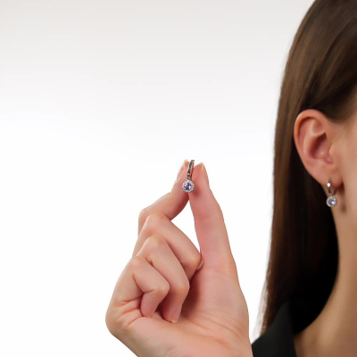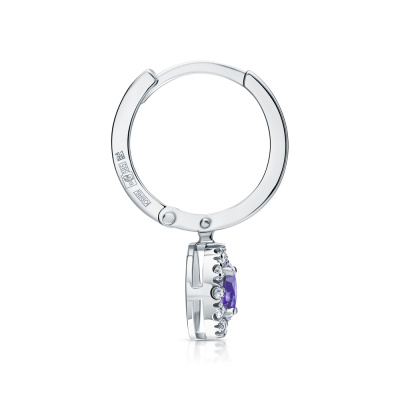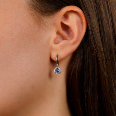 Серьги с 24 бриллиантами природными, 0.09 карат, огранка круг 17 граней, цвет 2, чистота 2, тип огранки А; 2 танзанитами природными, 0.49 карат; Белое золото 585 пробы.