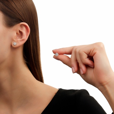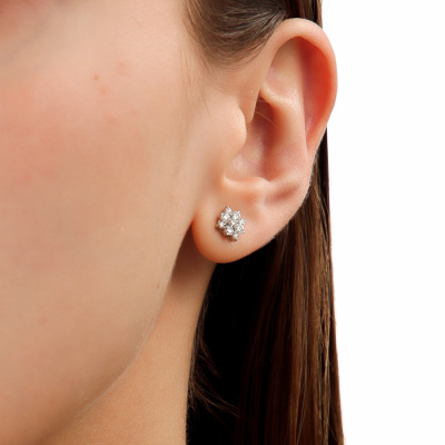 Серьги с 8 бриллиантами природными, 0.32 карат, огранка круг 57 граней, цвет 3, чистота 6, тип огранки А; 10 бриллиантами природными, 0.14 карат, огранка круг 57 граней, цвет 3, чистота 6, тип огранки А; Белое золото 585 пробы.