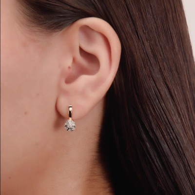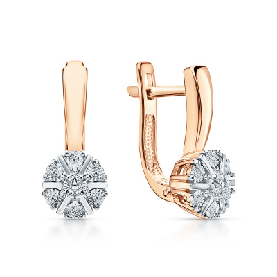 Серьги с 6 бриллиантами природными, 0.05 карат, огранка круг 57 граней, цвет 3, чистота 6, тип огранки А; 12 бриллиантами природными, 0.03 карат, огранка круг 17 граней, цвет 2, чистота 2, тип огранки А; Розовое и белое золото 585 пробы.