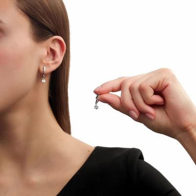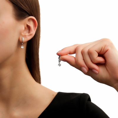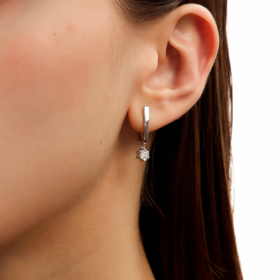 Серьги с 2 бриллиантами природными, 0.14 карат, огранка круг 57 граней, цвет 3, чистота 6, тип огранки А; Белое золото 585 пробы.