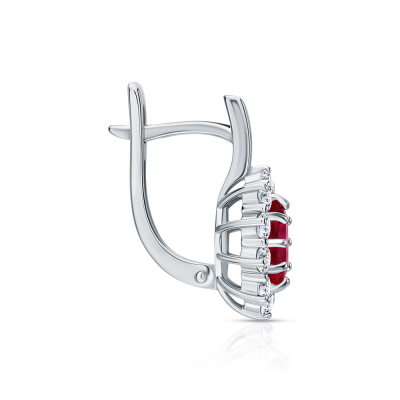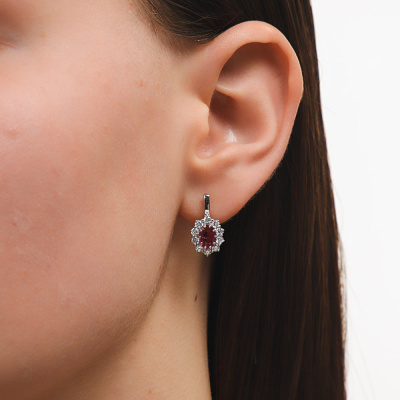 Серьги с 20 бриллиантами природными, 0.76 карат, огранка круг 57 граней, цвет 3, чистота 6, тип огранки А; 2 рубинами природными, 1.62 карат, цвет 2, чистота 2, тип огранки Б; Белое золото 585 пробы.