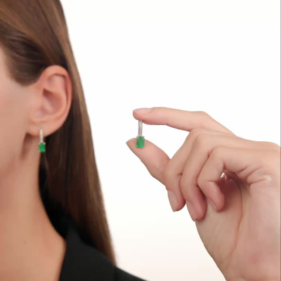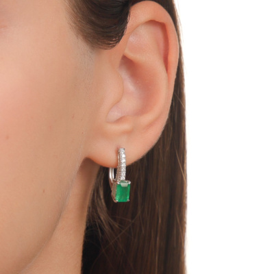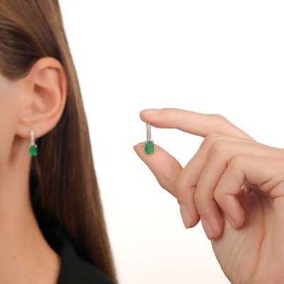 Серьги с 14 бриллиантами природными, 0.14 карат, огранка круг 57 граней, цвет 3, чистота 6, тип огранки А; 24 бриллиантами природными, 0.17 карат, огранка круг 57 граней, цвет 3, чистота 6, тип огранки А; 26 бриллиантами природными, 0.1 карат, огранка круг 57 граней, цвет 3, чистота 6, тип огранки А; 46 бриллиантами природными, 0.08 карат, огранка круг 57 граней, цвет 3, чистота 6, тип огранки А; 2 изумрудами природными, 1.68 карат, цвет 3, чистота 3, тип огранки Б; Белое золото 585 пробы.