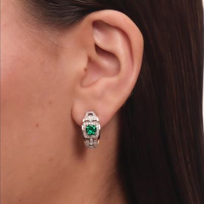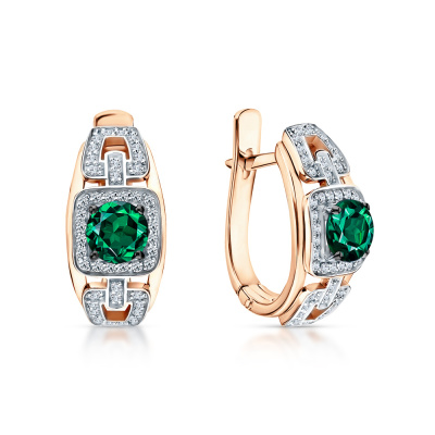Серьги с 88 бриллиантами природными, 0.34 карат, огранка круг 17 граней, цвет 2, чистота 2, тип огранки А; 2 гидротермальными изумрудами, 1.05 карат; Розовое золото 585 пробы.