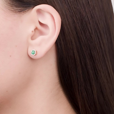 Серьги с 32 бриллиантами природными, 0.1 карат, огранка круг 17 граней, цвет 2, чистота 2, тип огранки А; 2 изумрудами природными, 0.45 карат, цвет 3, чистота 3, тип огранки В; Розовое золото 585 пробы.