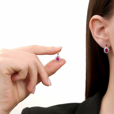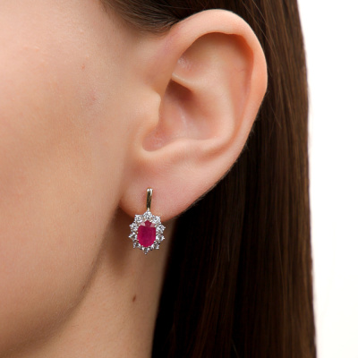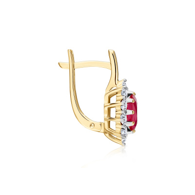Серьги с 20 бриллиантами природными, 0.73 карат, огранка круг 57 граней, цвет 3, чистота 5, тип огранки А; 2 рубинами природными, 1.7 карат, цвет 2, чистота 2, тип огранки Б; Желтое золото 585 пробы.